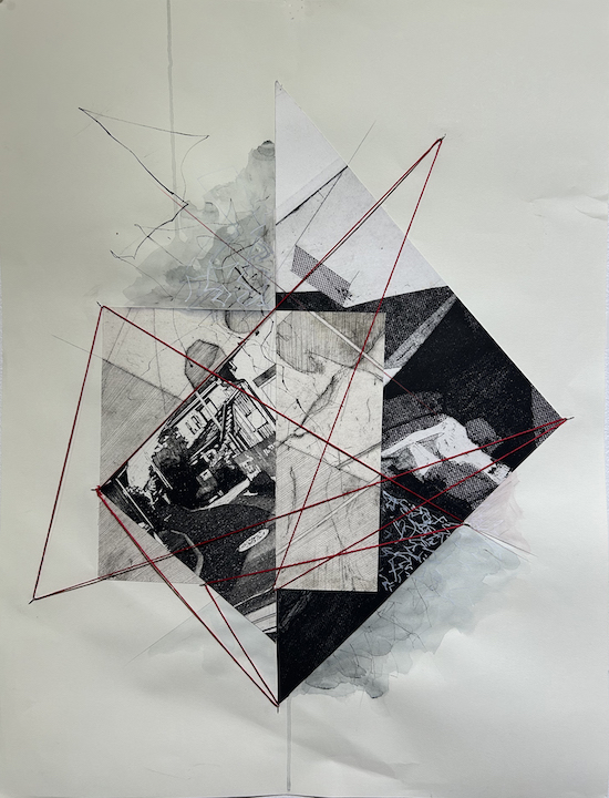 Etching, monotype, sumi ink, & watercolor, & thread on paper