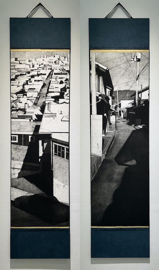 Etching, Aquatint, Drypoint mounted on folding scroll with momigami paper (by Liza Dalby)